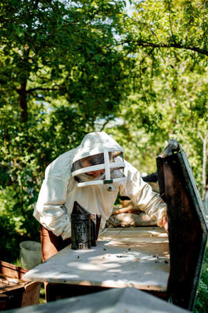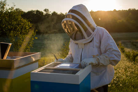 Eco apiculture and honey production business. Beekeeper fumigating bees with smoke to remove honeycombs from the apiary houses. Beepeeking process.