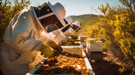 Sweet Harvest: Beekeeper Tending to Hives in Honey Farming. Generative ai. High quality illustration