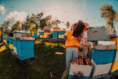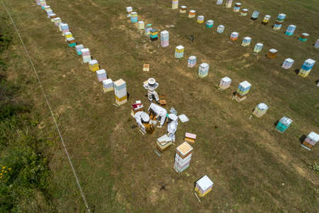 Beekeepers checking honey on the beehive frame in the field. Small business owners on apiary. Natural healthy food produceris working with bees and beehives on the apiary.