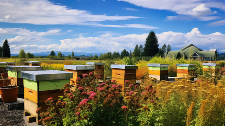 beekeeping apiary with rows of beehives surrounded by pollinator gardens, created with generative ai
