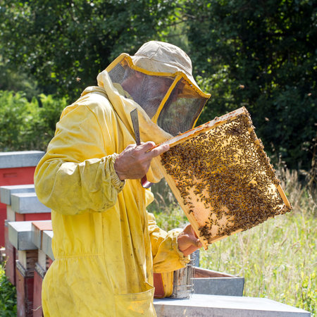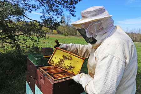 A beekeeper in protective clothing holds a frame with honeycombs, examines bees in the apiary. Preparing for the harvest of honey.