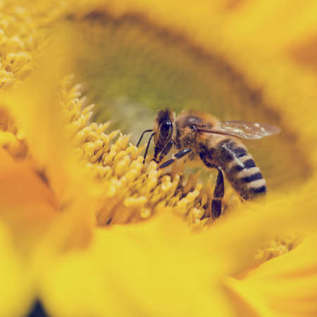Close up of a honeybee, Apis mellifera, foraging for pollen on a bright yellow sunflower pollinating the crop as it passes from flower to flower.