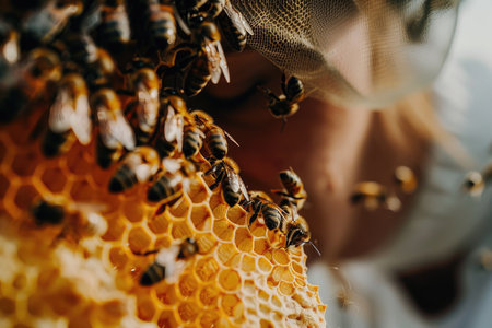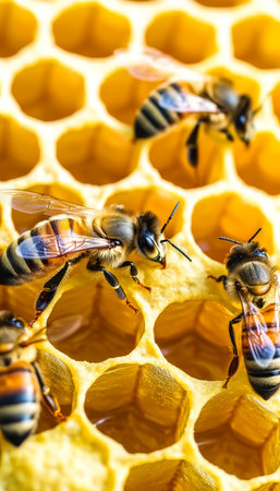 Close-Up of Busy Bees Working on Honeycomb Cells in a Vibrant Insect Colony Producing Honey