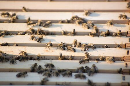 Bees sit on honeycombs with honey in a bee frame in a beehive close-up. Beekeeping, sealing honeycombs with wax and pouring honey, breeding and keeping bees