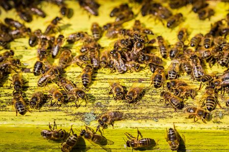 Plenty of bees at the entrance to beehive in apiary. Busy bees close up view of the working bees.