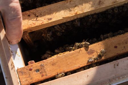 Bee hives of a beekeeper in the care of bees with honeycombs and honey bees