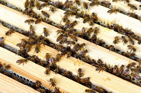 Close up view of the working bees on honeycells. Beekeeping concept.