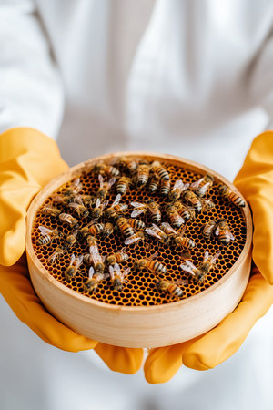 Beekeeper Inspecting Honeycomb Frame with Bees, Honey Production, and Hive Health Check