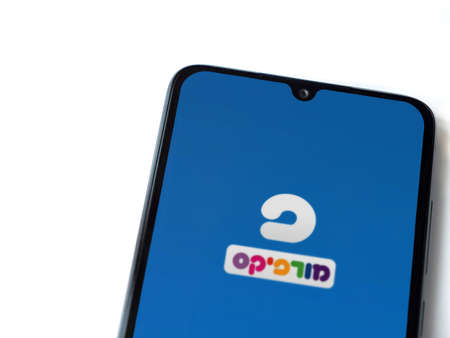 Lod, Israel - July 8, 2020: Morfix app launch screen with logo on the display of a black mobile smartphone isolated on white background. Top view flat lay with copy space.