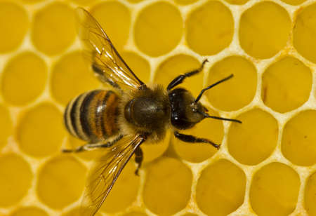 Bee on a honeycomb in a hive. Detailed macro image of a bee collecting honey in a beehive