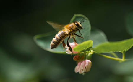 Bee in flight on a flower, honey bee. High resolution photo. Selective focus. Shallow depth of field.