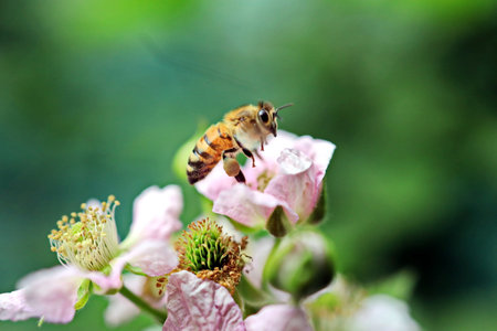 Close-up of a honey bee looking for pollen on a raspberry blossom against a green background