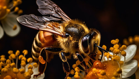 A close-up shot of a honeybee pollinating a flower, showing the intricate details of its body and the beauty of nature.