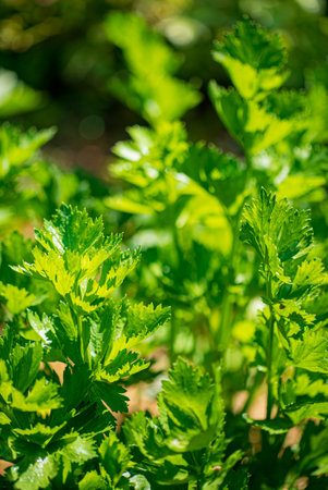 Celery growing in a vegetable garden on a sunny summer day