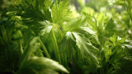 The Lovage in spring, fresh green leaves, soft sunlight filtering, vibrant atmosphere full of vitality, natural textures, serene mood.
