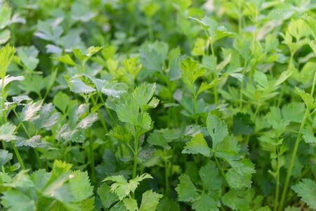close-up of growing celery plantation (leaf vegetables) in the vegetable garden at sunny day