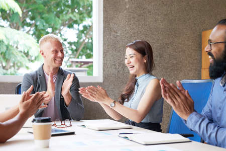 Group of smiling business people clapping hands while sitting at the table during a business meeting