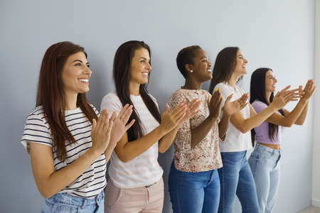 Happy positive diverse female audience applauding speaker. Group of smiling young women giving round of applause. Studio shot of five cheerful good looking ladies standing by wall and clapping hands