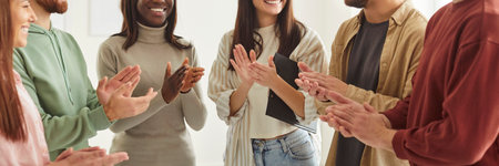 Friends clapping hands in circle close up, greeting, group meeting, grateful audience applauding thanking coach for presentation or seminar, successful team after accomplishing desired aim or result