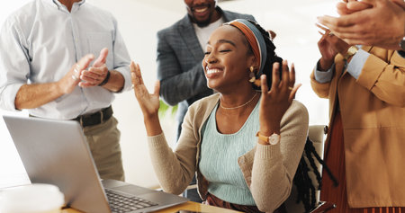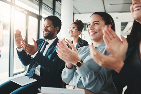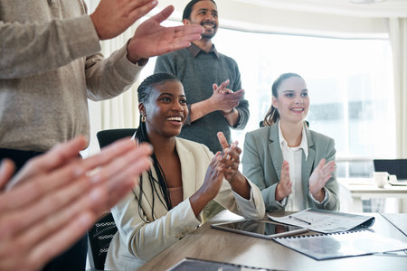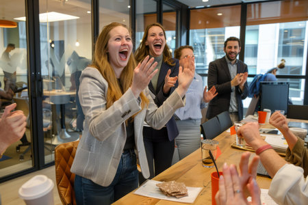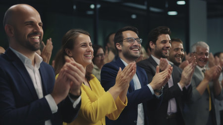 Diverse group of professionals applauding in modern office setting, showcasing expressions of joy and appreciation. atmosphere is positive and engaging, reflecting teamwork and collaboration