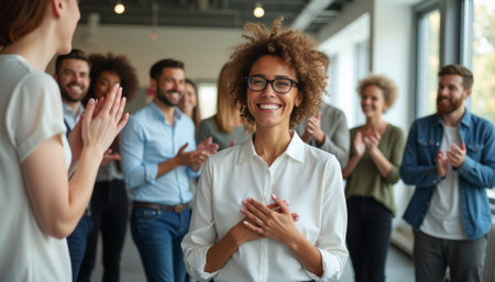 A cheerful woman with curly hair and glasses stands at the forefront, beaming with joy as she receives applause from a diverse group of colleagues in a modern office. The atmosphere is filled with celebration and camaraderie, highlighting teamwork and appreciation in a professional environment.