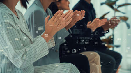 Happy audience applauding at a show or business seminar,theater performance listening and clapping at conference and presentation.Group of supporters,fans cheering excited applauding closeup