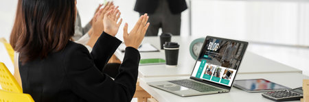 Great presentation Group of happy business people in smart casual wear sitting together at the table and applauding to someone : Generative AI