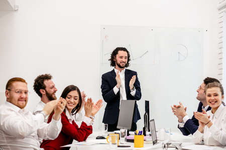 Creative agency meeting - group of business people in casual wear talking during conference at office and applauding during speech.