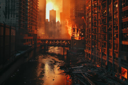Urban disaster scene depicting a massive inferno engulfing buildings near a river at dusk
