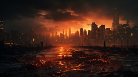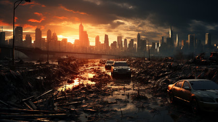 Post-apocalyptic landscape. City after the effects of global warming. Climate changes concept.Generative AI