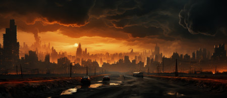 Fiery Sunset Over a Ruined Cityscape