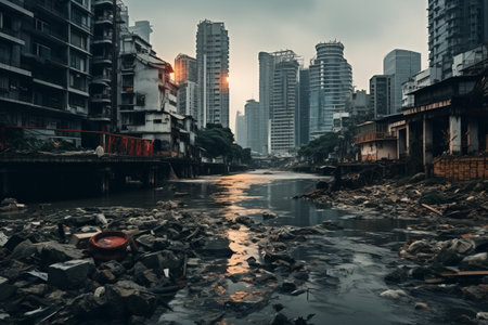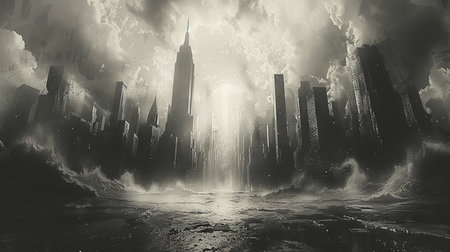 AI Generated. Light and darkness Stormy post apocalypse city End of the world City destruction Water destruction Stormy weather