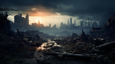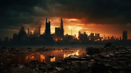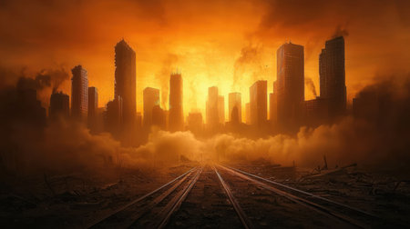 A destroyed city skyline, sunset, smoke, dramatic sky, urban ruins, apocalyptic mood