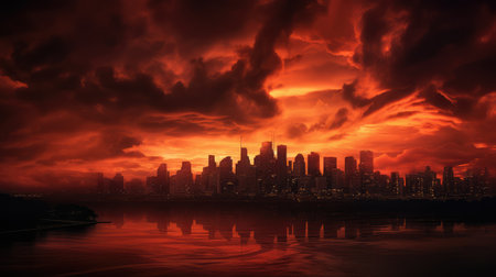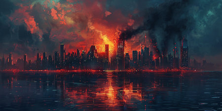 A dramatic landscape of a city engulfed in flames, with a fiery skyline reflected in a dark, still lake The scene conveys a sense of destruction and chaos