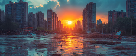 Post-flood urban scene with destroyed buildings and debris under a dramatic sunset sky