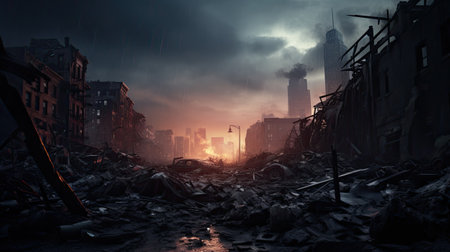 AI Generated. Ruined cityscape with fires raging under a gloomy sky