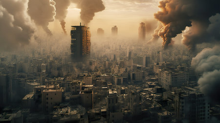 An urban area veiled in heavy smoke, releasing significant amounts of harmful pollutants into the air, World collapse, doomsday scene depicted in a digital painting, AI Generated