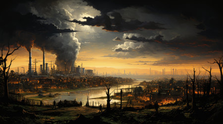 A Dystopian Apocalyptic World: Heavy Pollution and Sunlight Deprivation Creating a Futuristic Nightmare Atmosphere. Concept Dystopian Society, Apocalyptic World, Environmental Degradation