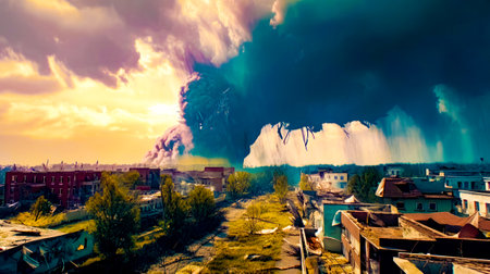 Mushroom cloud rises above a destroyed city in a chilling depiction of nuclear devastation.