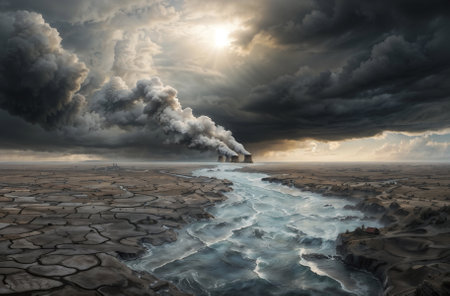 River with polluted toxic water flows through cracked barren earth to industrial nuclear plant under dramatic stormy sky. Apocalyptic dystopian future of global wasted planet and climate change.