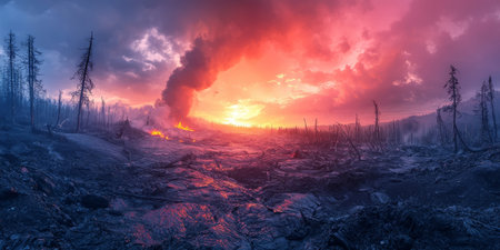 Destroyed landscape covered in ash and lava flow, remnants of trees and buildings in the foreground. Generative AI