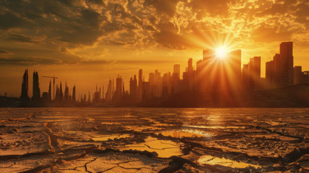 A sunset casts a warm glow over a city skyline while the ground exhibits dried cracked earth.