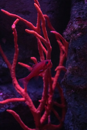Red coral reef in the aquarium. Underwater world. Aquarium fish
