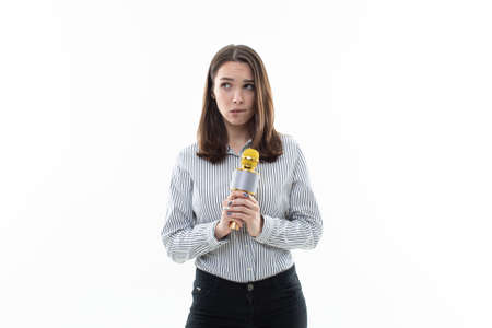 A young woman came up with the idea of what to sing in karaoke. Portrait of a beautiful young woman with a microphone in her hands on a white background. Karaoke Club