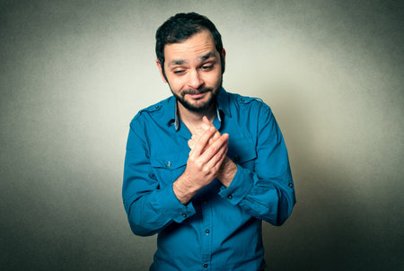 The guy dressed in blue t-shirt feels bewildered and anxious