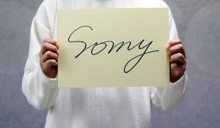 Flowers and paper sheet with text I AM SORRY on wooden background