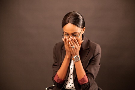 African american woman hiding her face with the help of her hands sitting on a brown background.