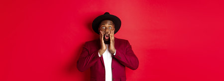 Fashion and party concept. Impressed Black man in classy outfit staring with complete disbelief at camera, gasping and looking surprised, standing over red background