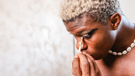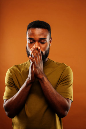 anxious praying black man with hands in his face white background - close-up shot. High-quality photo