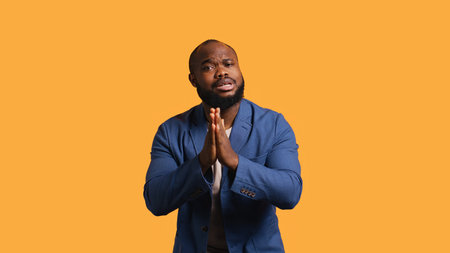 Friendly african american man puts hands together in apology gesture, asking for forgiveness. Apologetic BIPOC man doing sorry gesturing, asking for pardon, isolated over studio background, camera B